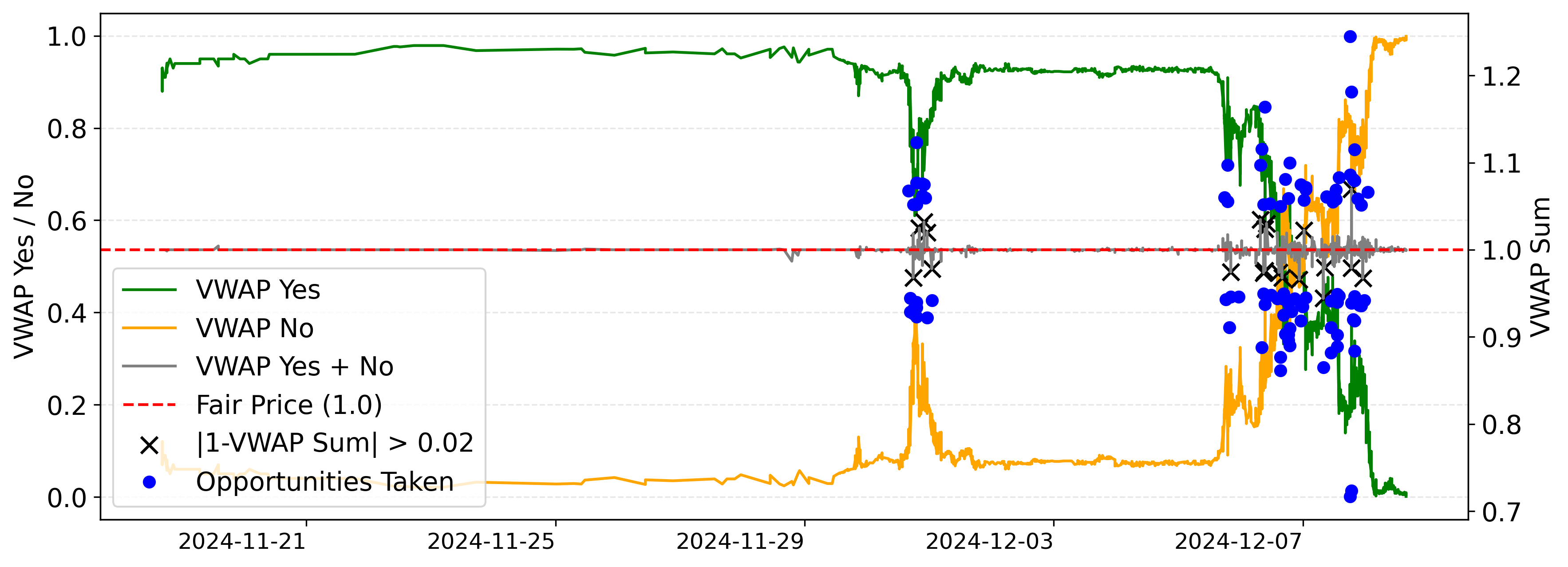 Below we show how these opportunities look like over time with a market capturing whether Assad would remain president of Syria. We see that for the majority of the market duration, the YES position held at over .90, with the market flipping in early December with rebel forces seizing Damascus. The black x’s show when arbitrage opportunities existed in this market with a margin of more than $0.02 profit per Dollar (from a weighted average of prices from executed bids). Given historical bid data, we also find players who purchased (or sold) both tokens at a guaranteed profit. We see that these opportunities exist at times of uncertainty in the market, and that our estimates of profit generally undercount the potential arbitrage profit players are able to execute.