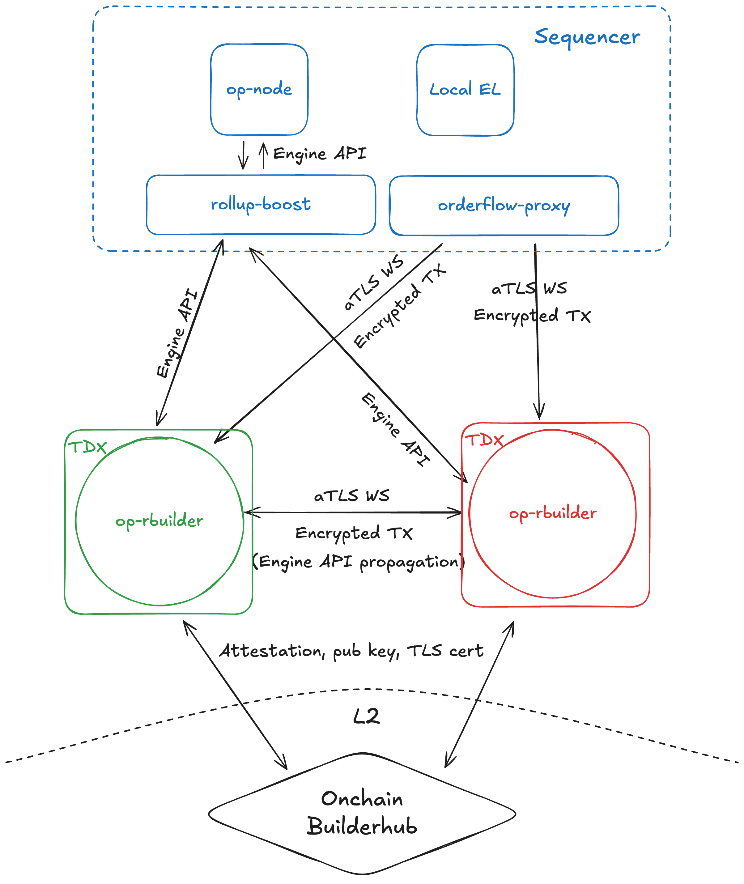 By adopting this concept, we can enable op-rbuilders running inside TEEs to exchange attestations, verify each other’s software integrity, and securely share encrypted orderflow.