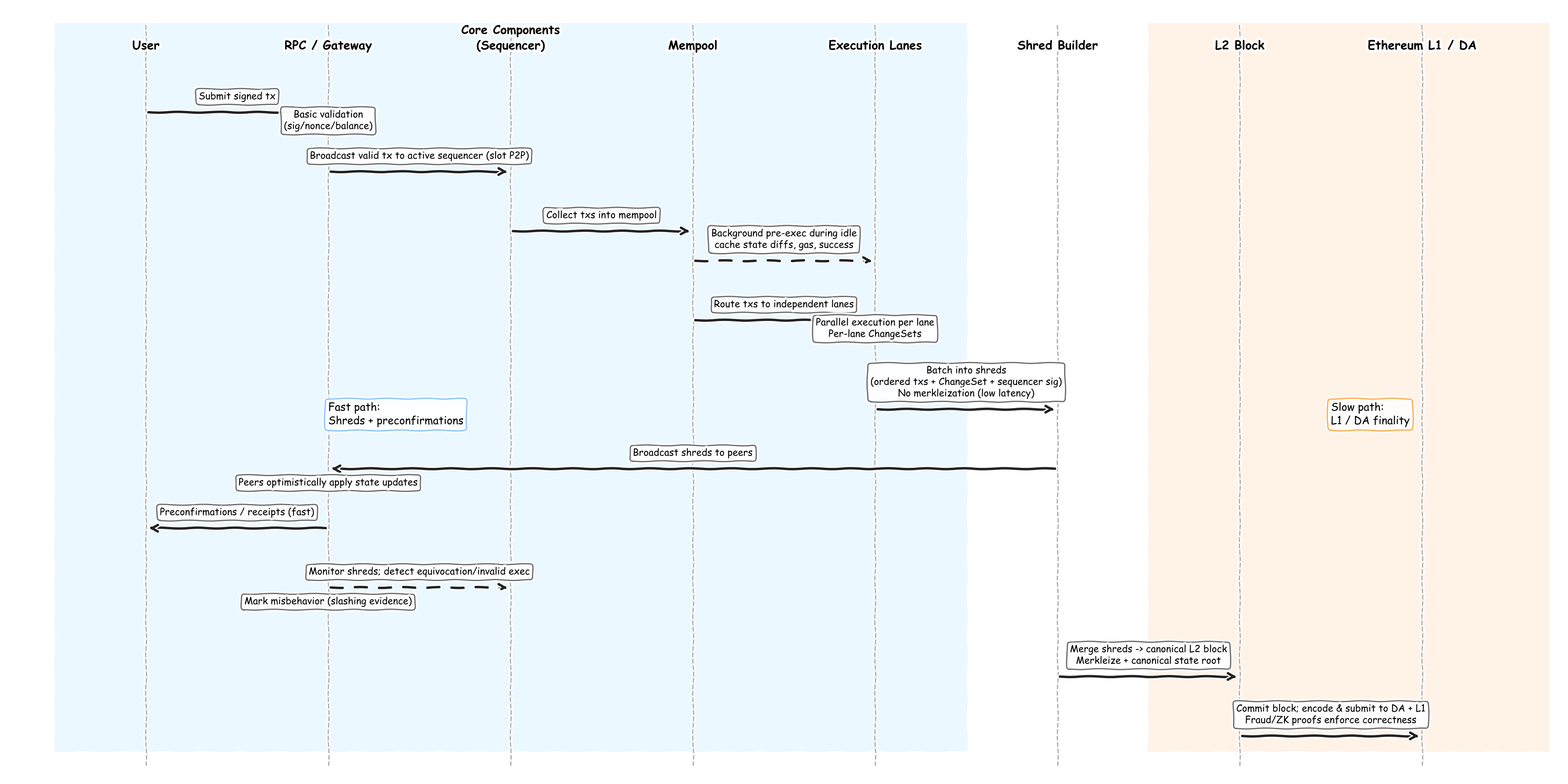 - Tx Ingest & Sanity Check: Users submit signed transactions to an RPC node; transactions undergo basic validation and are broadcast via P2P to the sequencer.