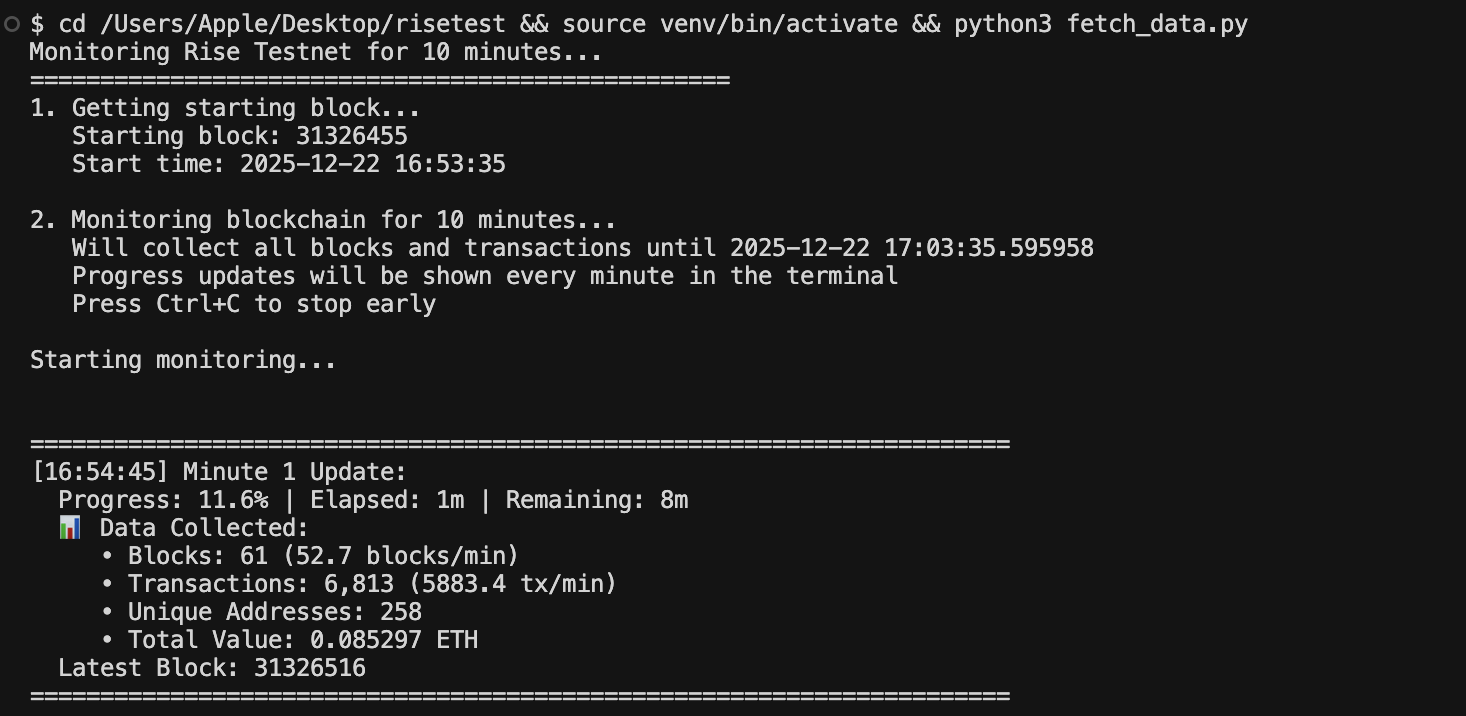 I wrote a 10-minute real-time script to capture RISE testnet data, ensuring that the measurement reflects actual network behavior within a controlled window. This interval provides a snapshot, long enough to capture meaningful trends, fluctuations, and performance patterns, yet short enough to avoid noise from rare or extreme events. By focusing on a precise 10-minute window, the data I collected is synonymous with and directly representative of the testnet network’s behavior in real time.