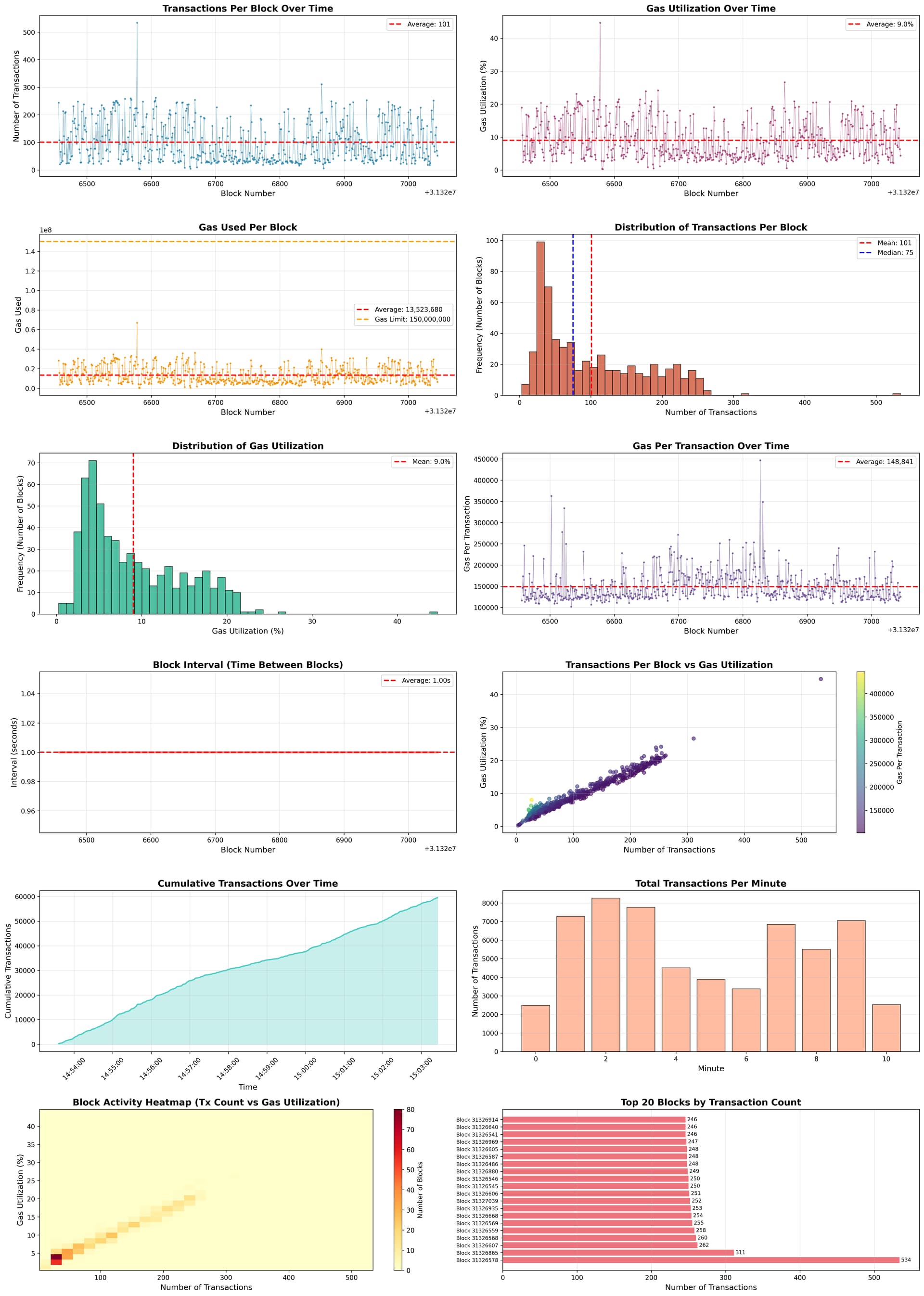 - Transactions per block: ~101, with block sizes around 110 KB, similar to Ethereum