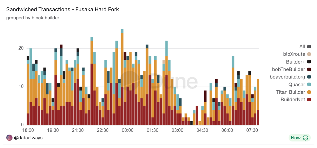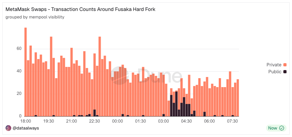 A demonstrative example is MetaMask Swaps, which under normal conditions routes more than 99% of user transactions through private mempools. During this PBS outage, private mempools became unviable, and we see that transactions were re-routed to the public mempool to ensure users could still get their transactions included onchain.
