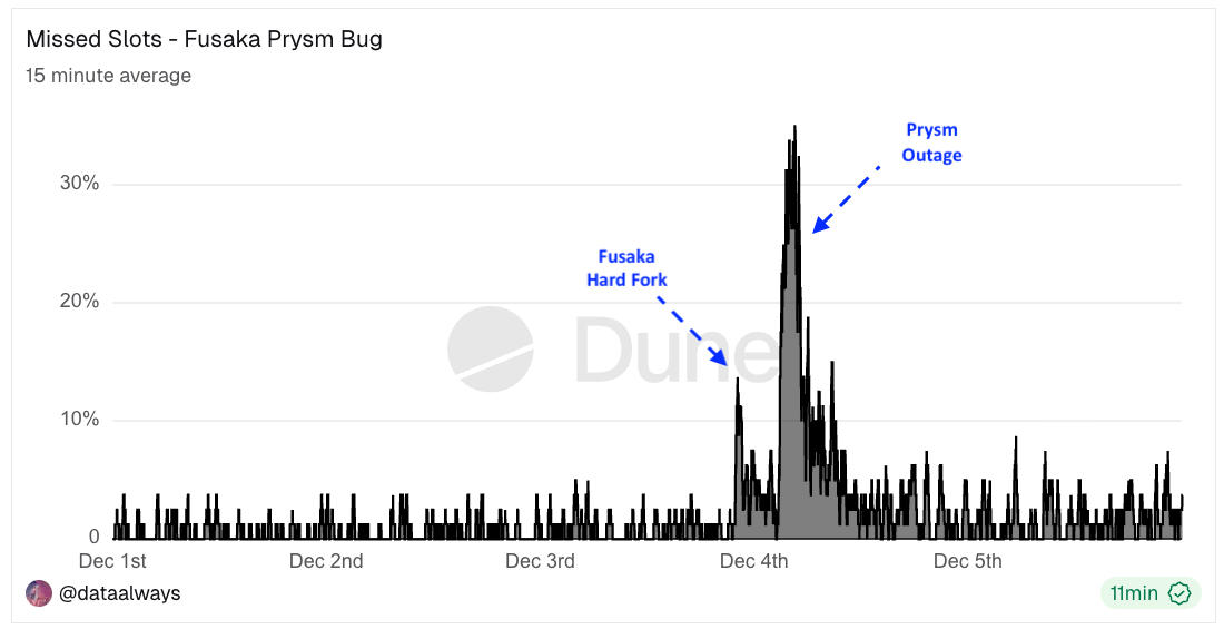 Shortly after the Fusaka hard fork on December 4, 2025, a bug in the Prysm consensus client knocked nearly all Prysm nodes offline. Although the chain stayed up and the Network never stopped finalizing, this was one of the largest liveness degradations in the history of proof-of-stake Ethereum: