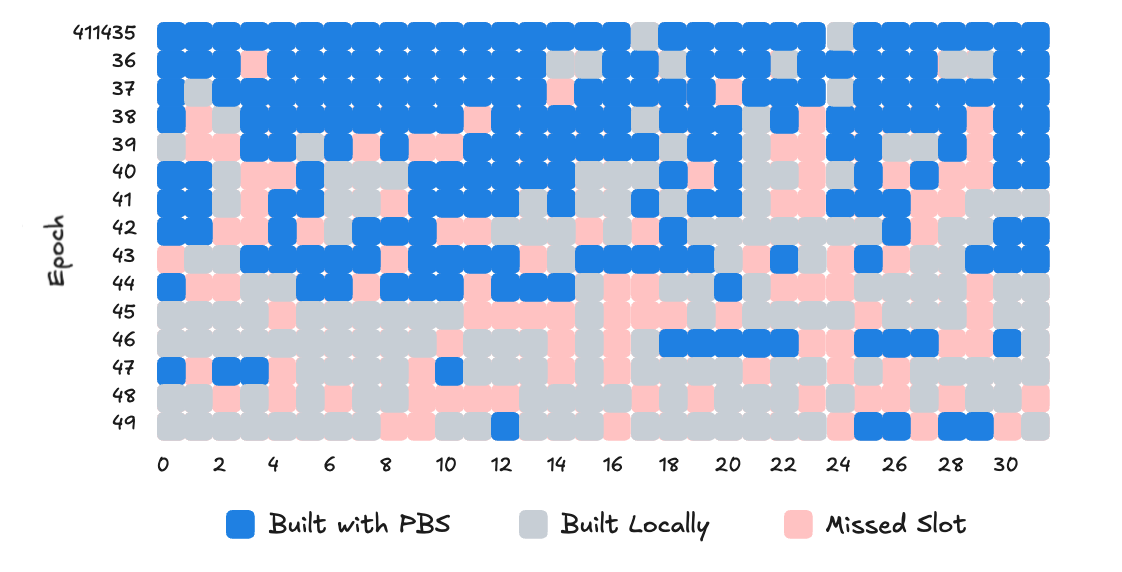 Per Prysm’s postmortem, network degradation began in epoch 411,439. Visualizing the sequencing of slots in the diagram below, we see that before the incident about 90% of blocks were built via PBS. However, starting around epoch 411,440 there is a large uptick in both missed slots and locally sequenced blocks.