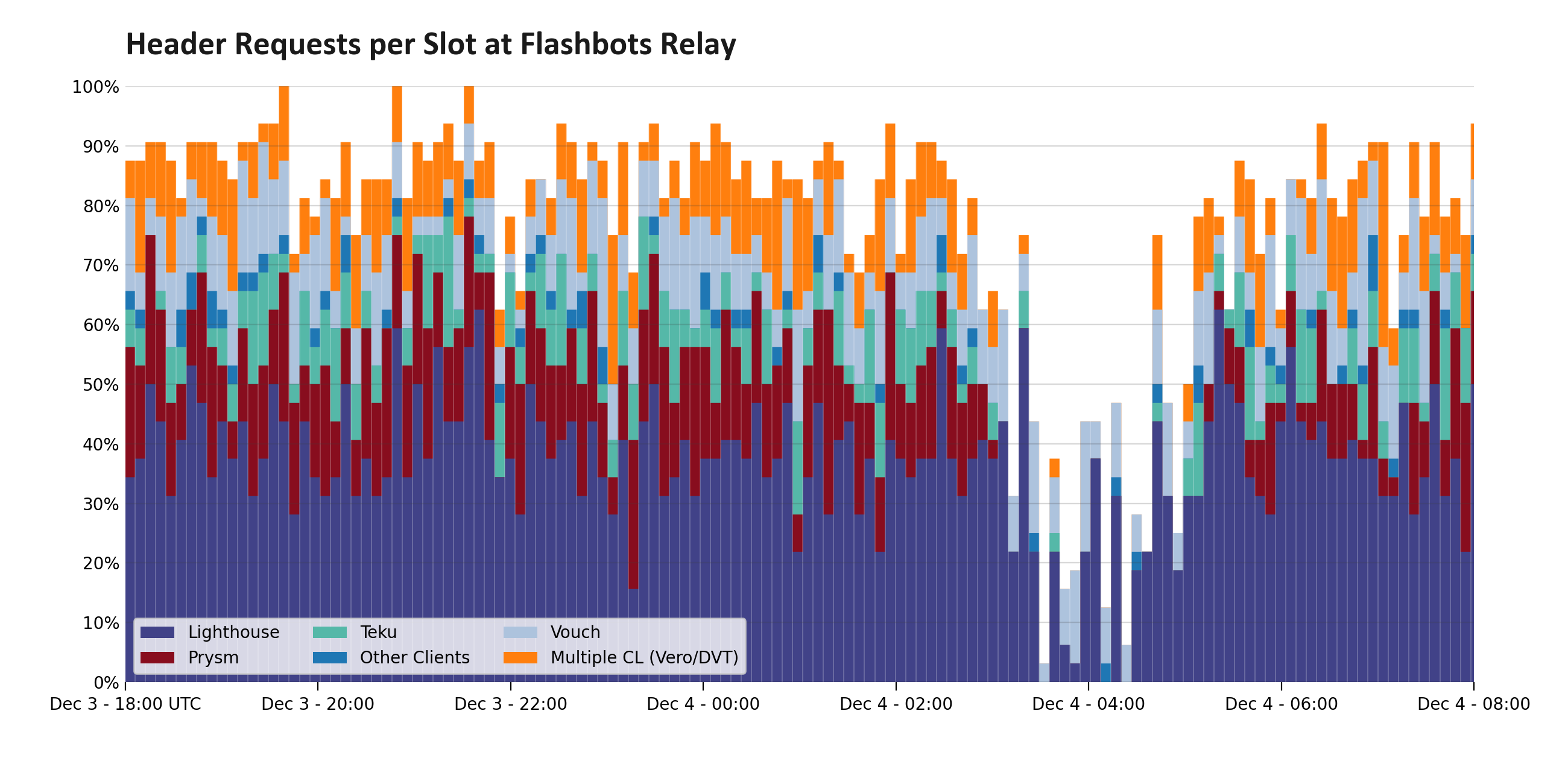 By epoch 411,444 (Dec 4, 2025 03:21:59 AM) circuit breakers had fully triggered. Proposers ceased asking relays for headers, leading to long stretches without outsourced block building. Although the bug was unrelated to the MEV supply chain and the Network remained live and finalizing, relays and block builders ceased to be active participants.