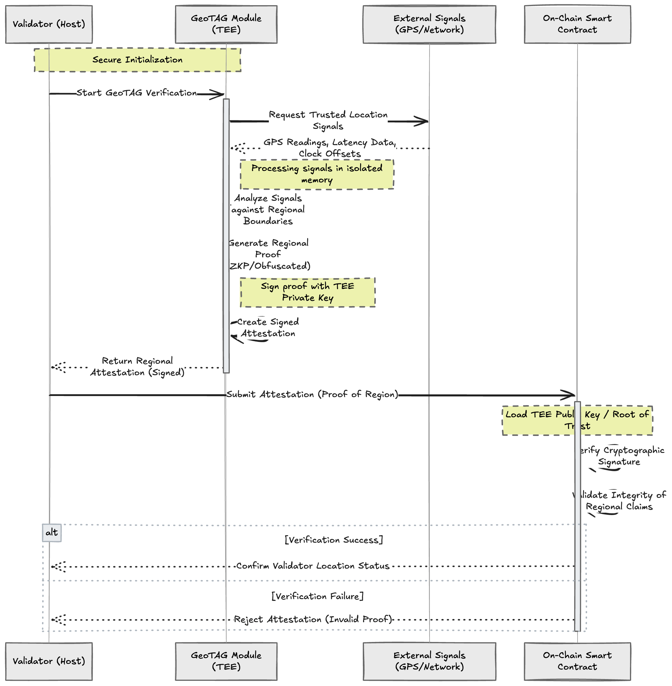 In a high-level GeoTAG flow, a validator runs a GeoTAG module inside a TEE. The module collects trusted location-related signals such as GPS readings, latency measurements to known reference points, or clock offsets. The TEE then generates a signed attestation asserting that the validator operates within a specific region without disclosing exact coordinates. This attestation is submitted to an on-chain smart contract, which verifies it using the TEE’s cryptographic keys, ensuring both authenticity and integrity.