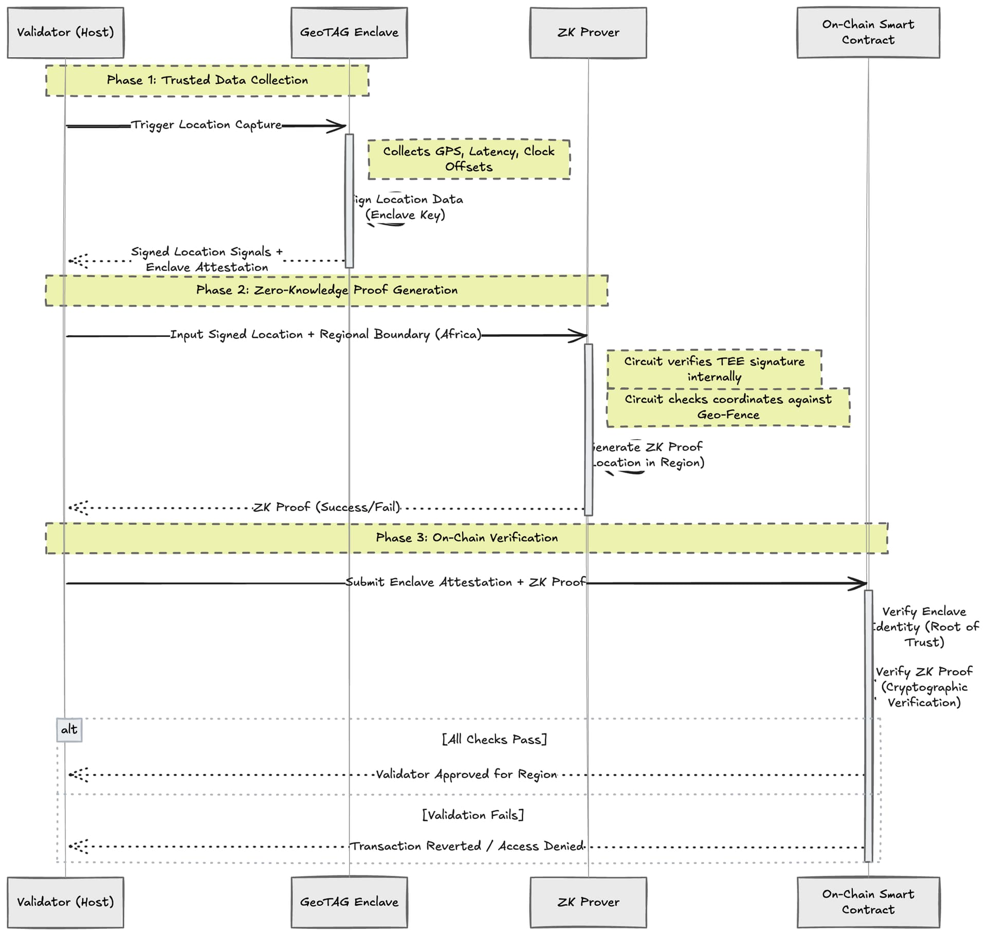 At a high level, a validator runs a GeoTAG module inside a TEE, which collects and signs location-related signals. A ZK circuit then proves that this signed input lies within a predefined region, such as Africa, without revealing exact coordinates. The validator submits both the enclave attestation and the ZK proof on-chain, where the contract verifies authenticity and regional membership together.