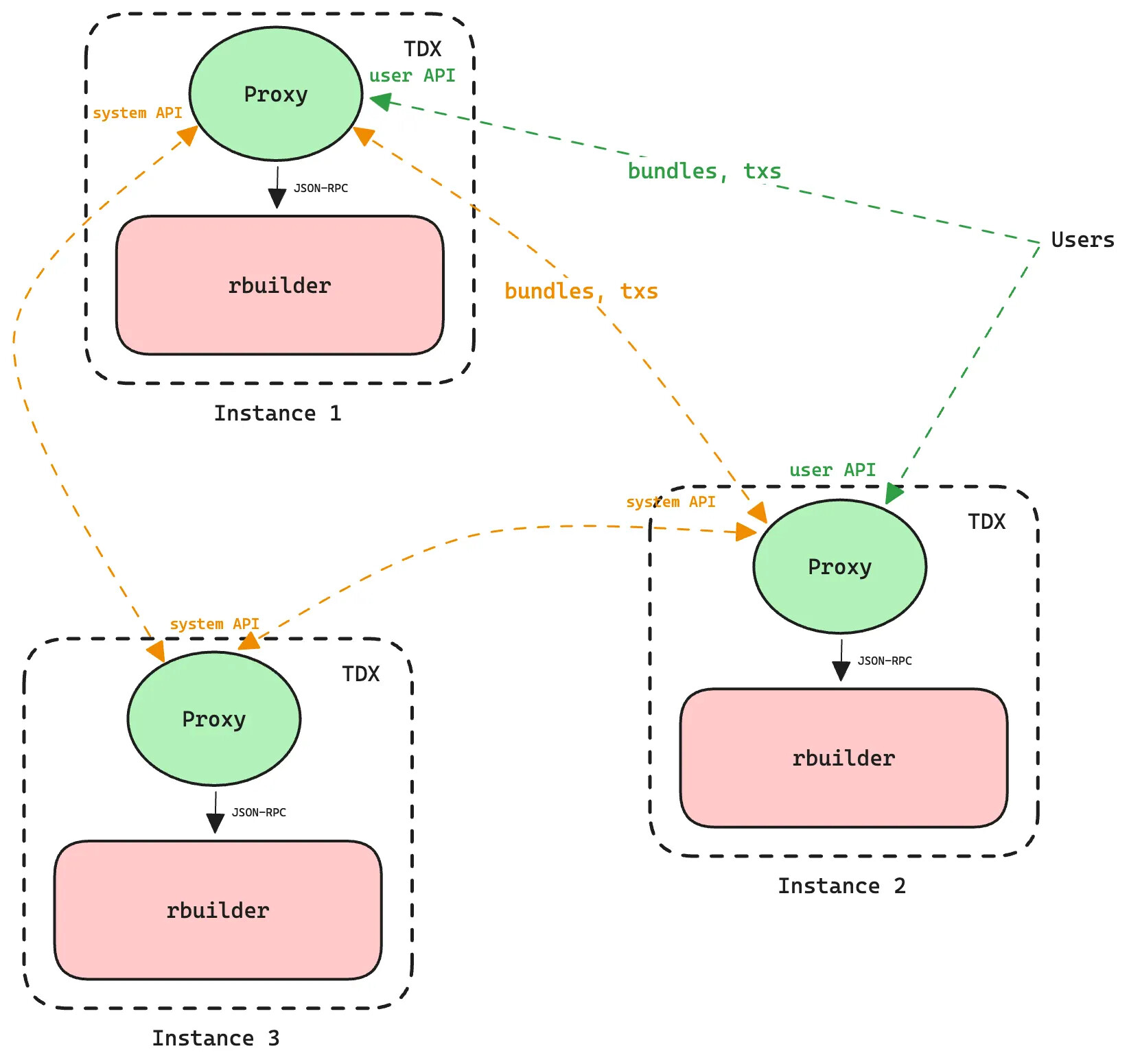 The orderflow proxy is a central component in BuilderNet. Itβs responsible for receiving bundles and transactions from users, and ensuring those orders are shared with all other instances in BuilderNet, as well as to the local rbuilder. Performance is an important aspect here: the faster these proxies can share orders, the more effective the builders will be able to collaborate, and the more blocks BuilderNet as a whole will win. If a proxy goes down for even a couple of seconds, that could mean 1000s of lost orders, so reliability is crucial too.