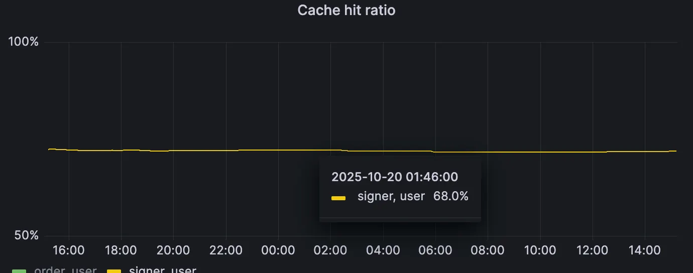 Proxy v2 running with transaction signature cache. For this instance we have that 68% of the requests received contain already processed transactions for which we can skip signature recovery. TTL applied is 36s.