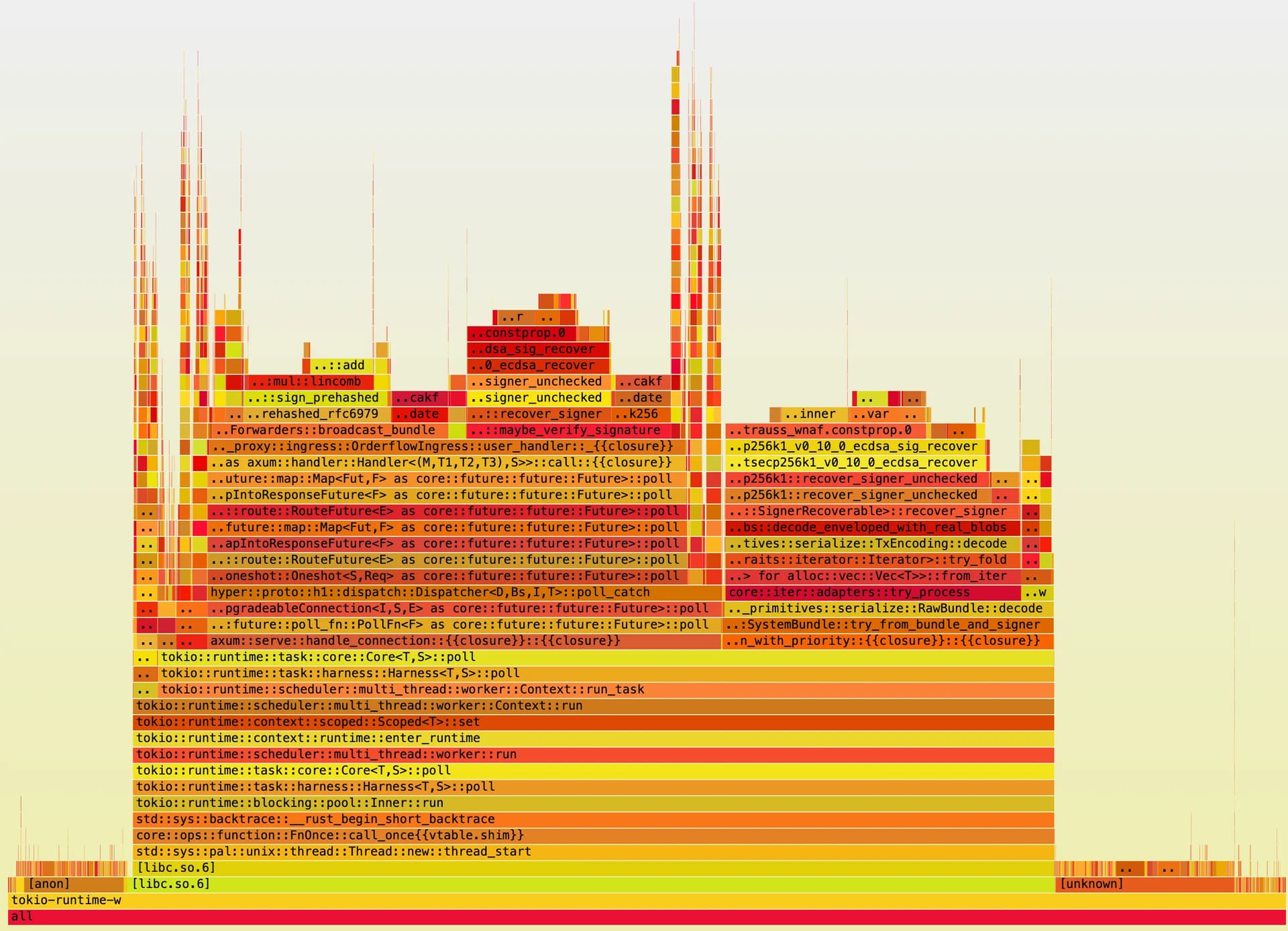 In stage 1, looking at some profiling results in the form of flamegraphs, it was immediately obvious that ECDSA signature verification was claiming the bulk of CPU cycles. This was true for both ingress proxies (who directly receive orders from users), and receiving proxies (who get forwarded these orders by the ingress proxies). In addition, ingress proxies that had to forward data also spent quite some time on hashing and signing messages.