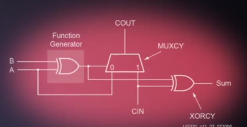 1 adder bit per LUT with carry lookahead and dedicated MUXCY and XORCY.