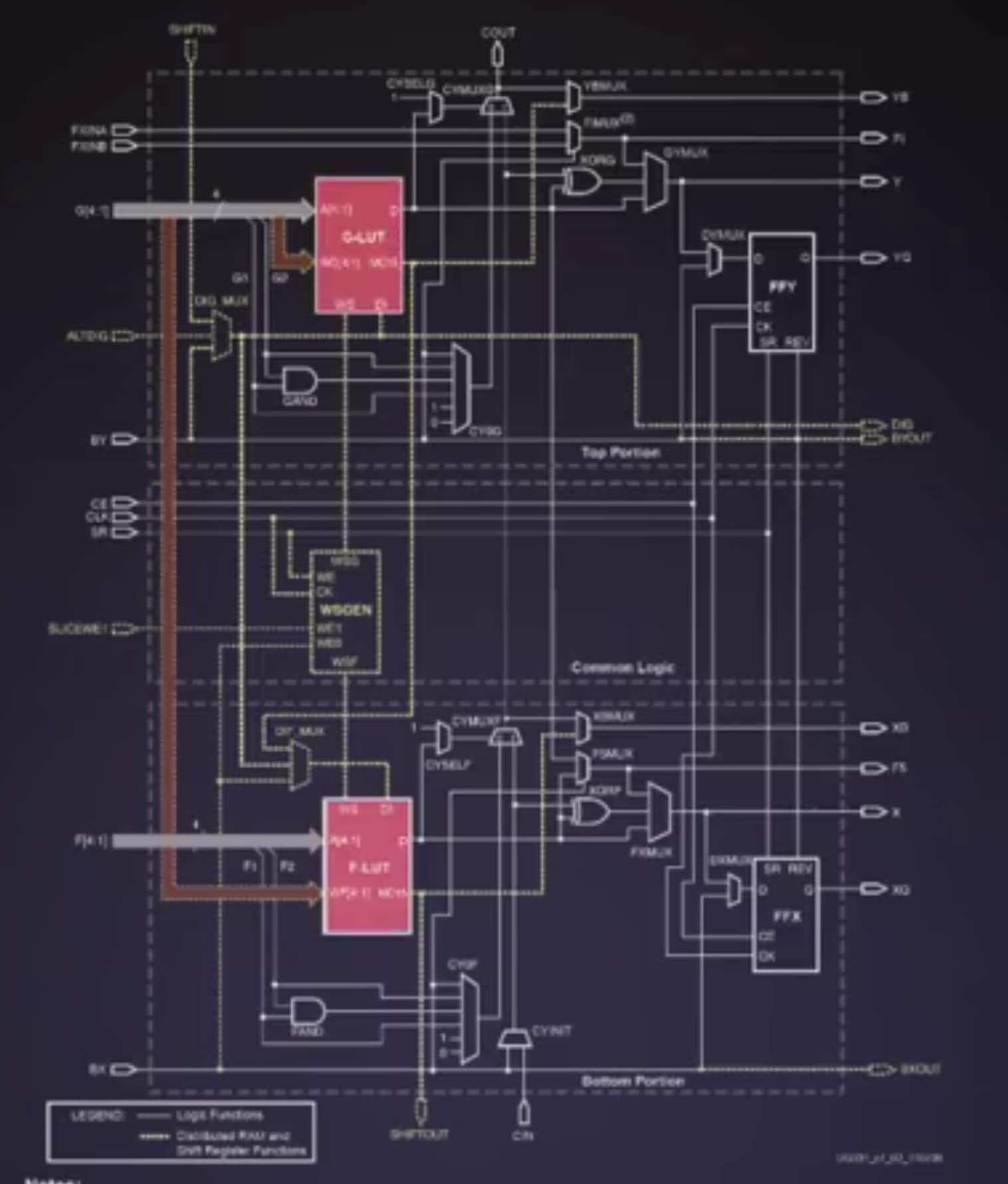 A slice has 2 4-input LUTs and 2 flip-flop outputs, plus some carry chain logic and shift-clock generation.