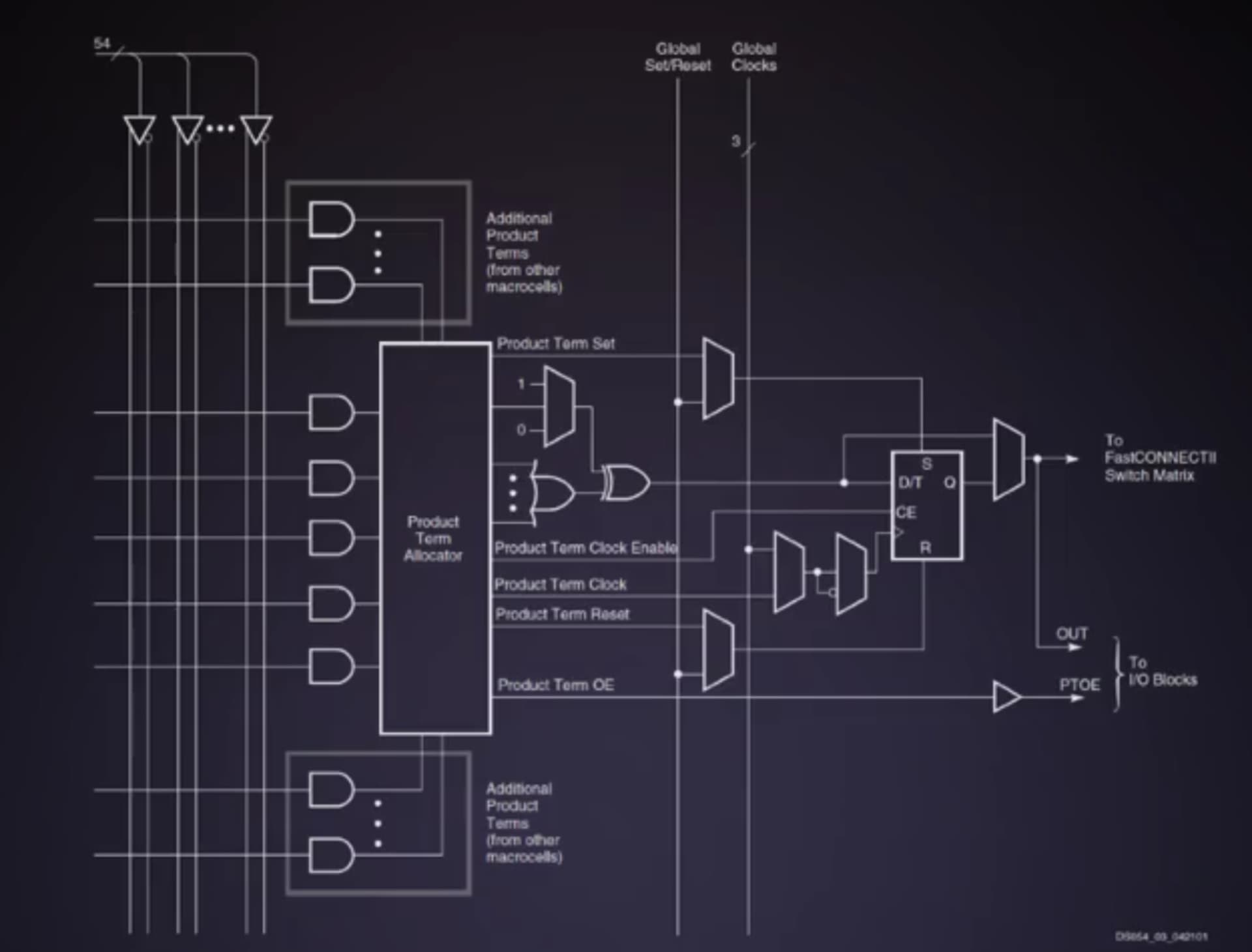 The macrocell can AND up to 54 signals, and then OR together 5 of these plus 5 from an adjacent macrocell.