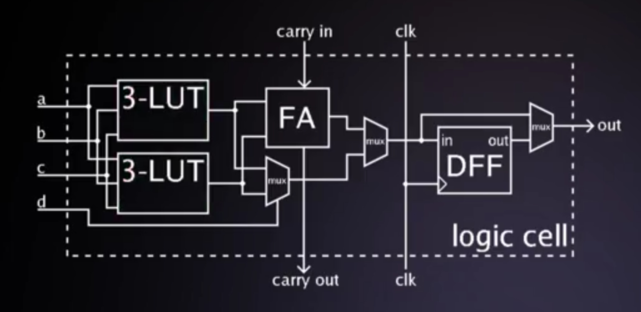 An FPGA logic cell consists of a 4-input LUT, a Full Adder (FA) and a D-type Flip-Flop. In normal mode the two LUTs are combined via a mux. In Arithmethic Mode the outputs are fed to the FA.