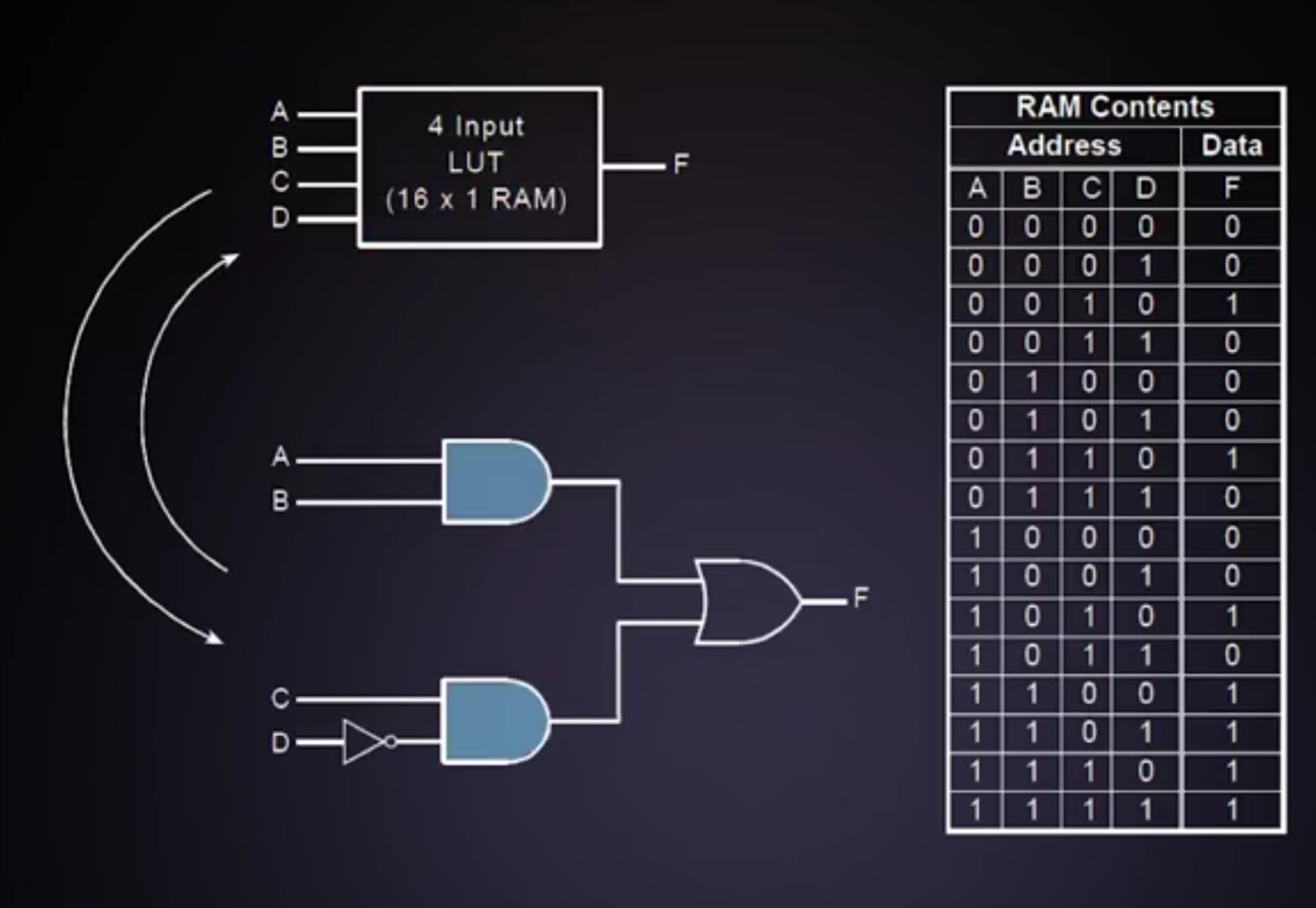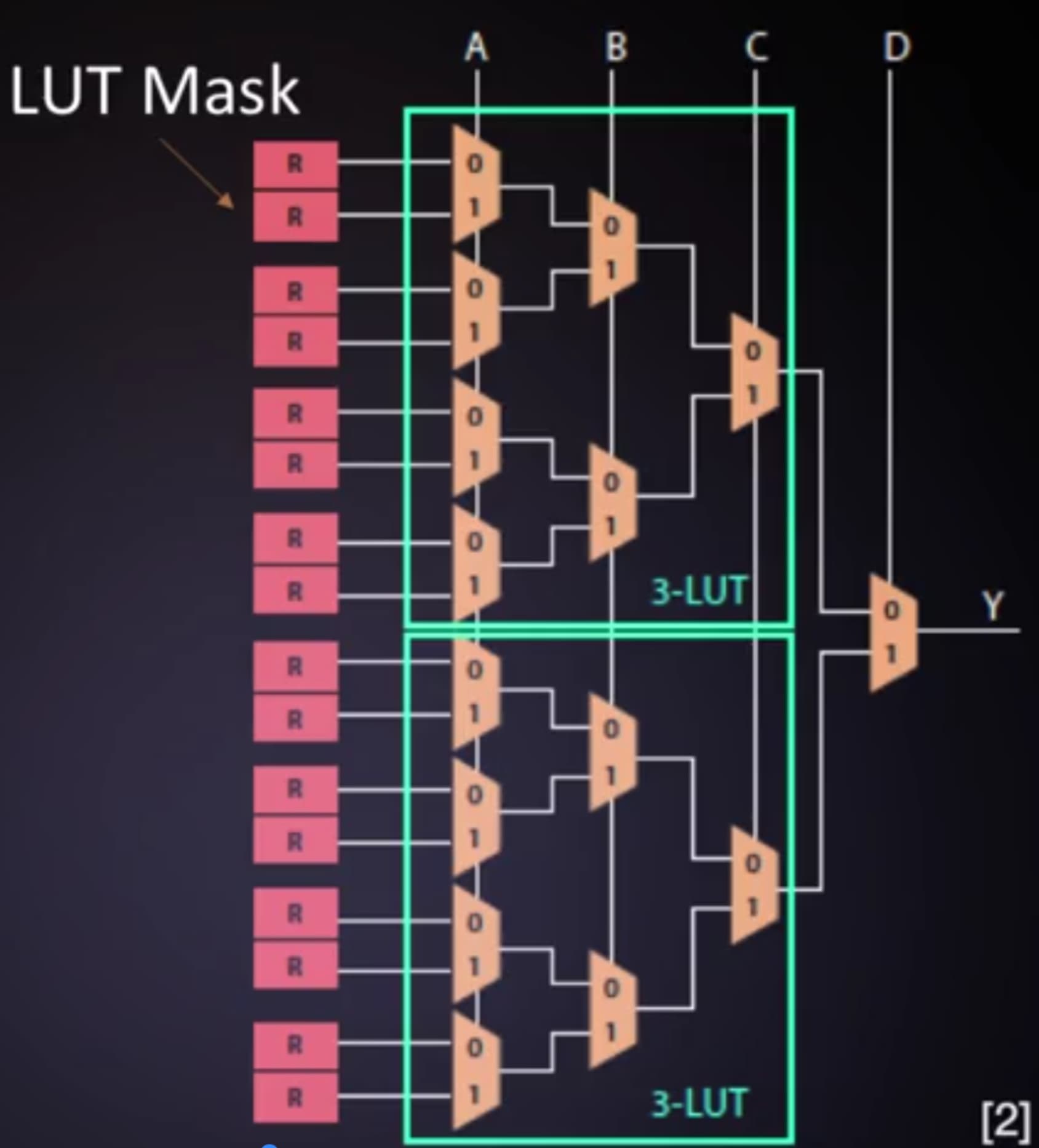 A LUT is tipically built out of SRAM bits to hold the configuration memory, a LUT mask and a set of multiplexerst to select the bit of the SRAM that drives the output.