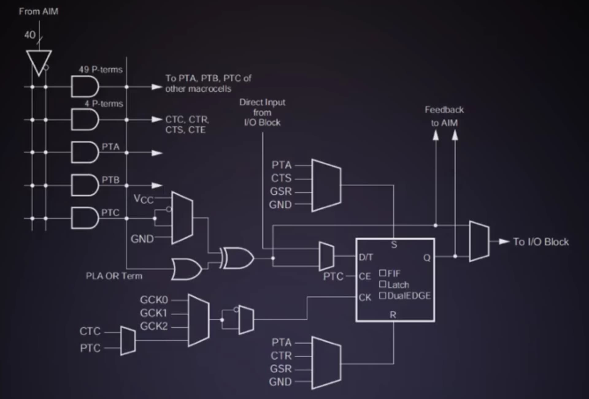 The macrocell can AND up to 40 signals and then or together 5 of these. Feed forward from other macrocells is through the AND array.