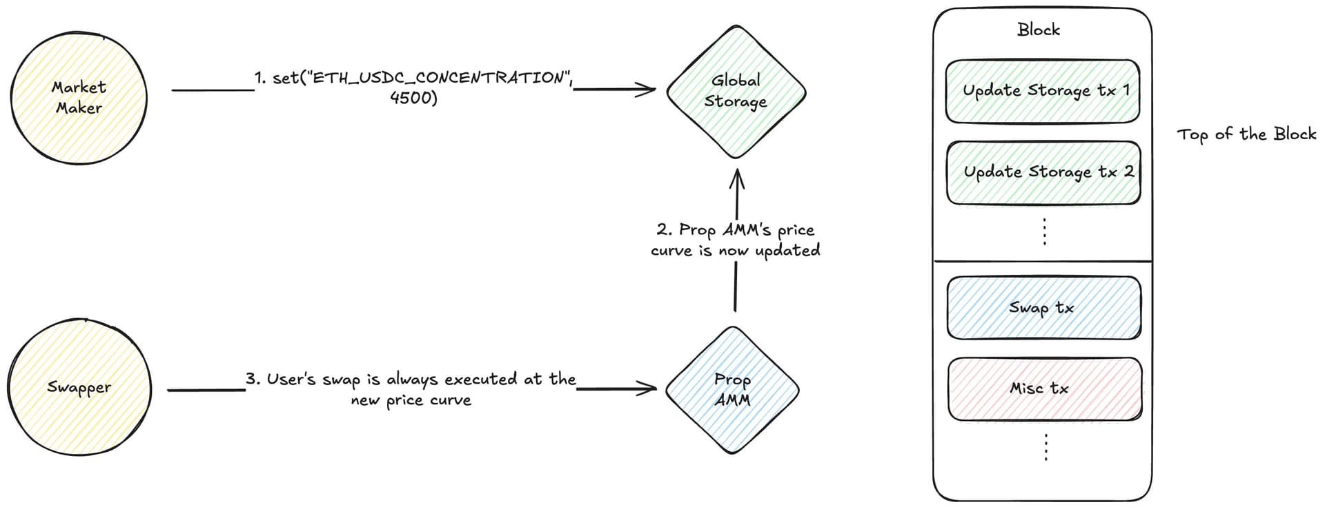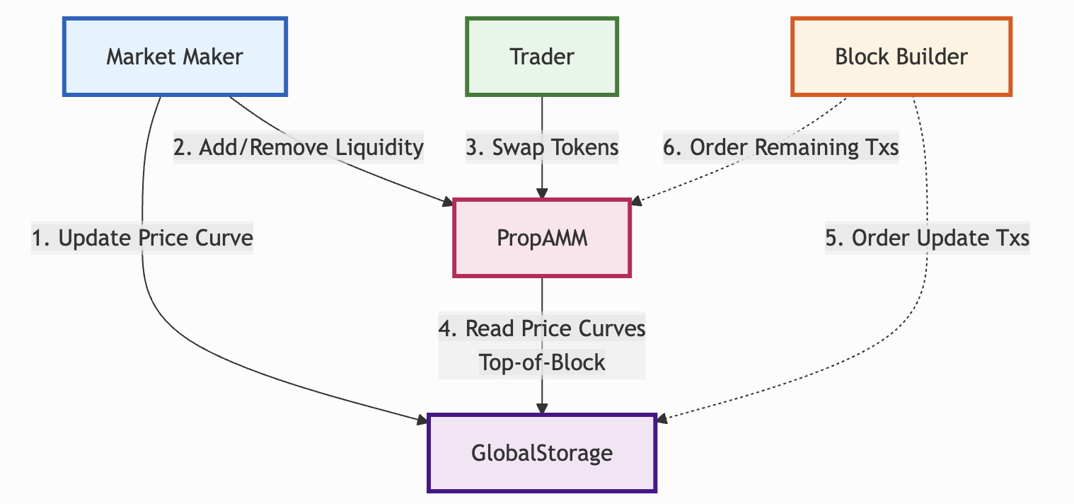 - Global Storage Contract: A single, simple smart contract is deployed to act as a public key-value store. Market makers write their price curve parameters to this contract (e.g., set(ETH-USDC_CONCENTRATION, 4000)). Prop AMMs would read this value when calculating quotes.