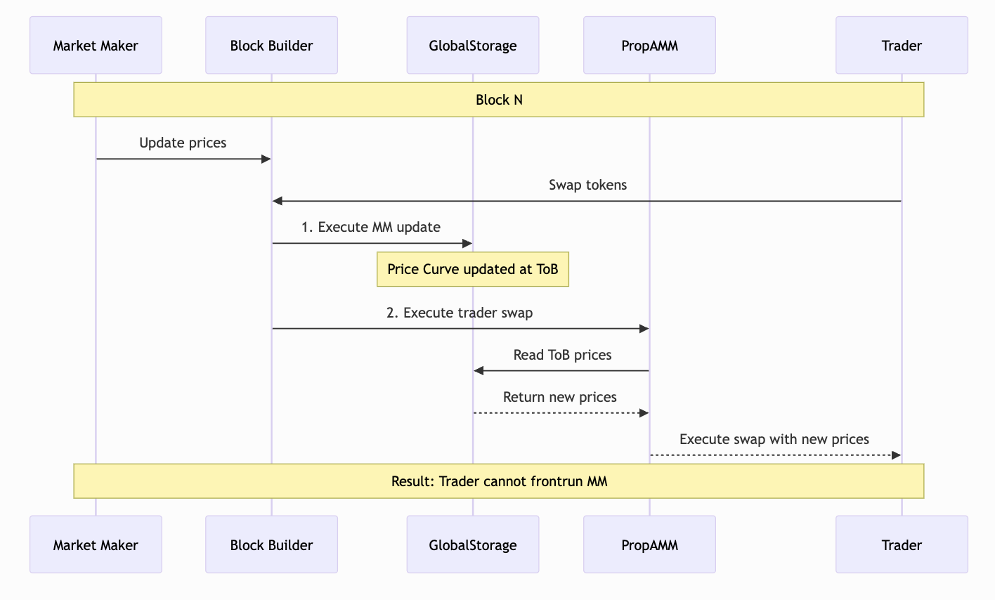 The image above depicts the high level flow of how a trade would use the latest Prop AMM update from the Market Maker, and how the update transactions are always Top of Block.