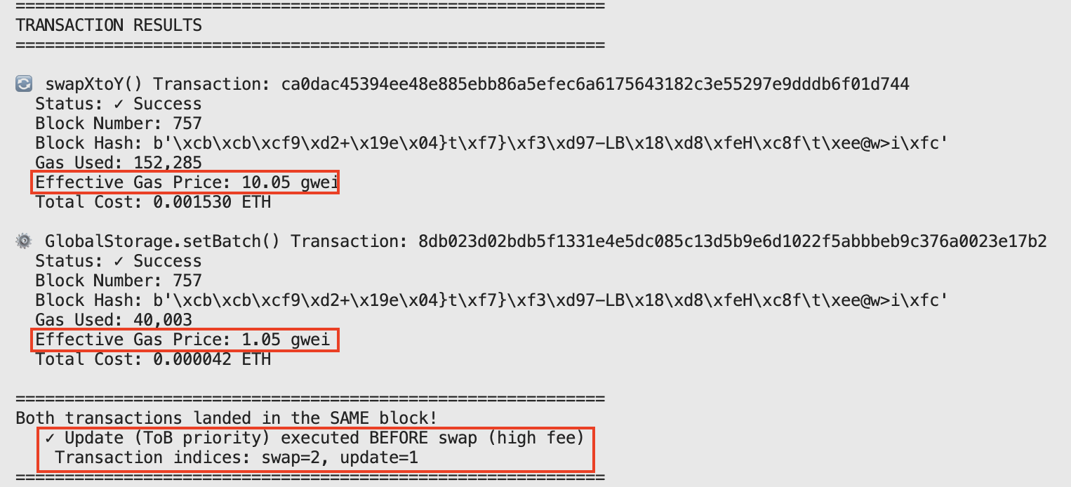 In the accompanying video demonstration (linked below), we showcase a live simulation of this architecture preventing a front-run attempt. The screenshot above showcases the result of an update transaction occurring Top of Block before a swap transaction, despite it having a lower gas price.