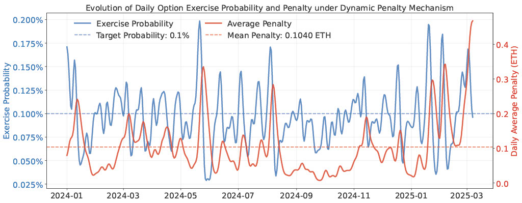 The mechanism gives strong theoretical guarantees and achieves, in historical block data, an average exercise probability of 0.096\%, well below the no-penalty baseline (0.82%) and comparable to the level under a high static penalty of 0.5 ETH (0.107%) with an average penalty of only 0.104 ETH. Beyond average conditions, the dynamic penalty mechanism also adapts effectively on high-volatility days.