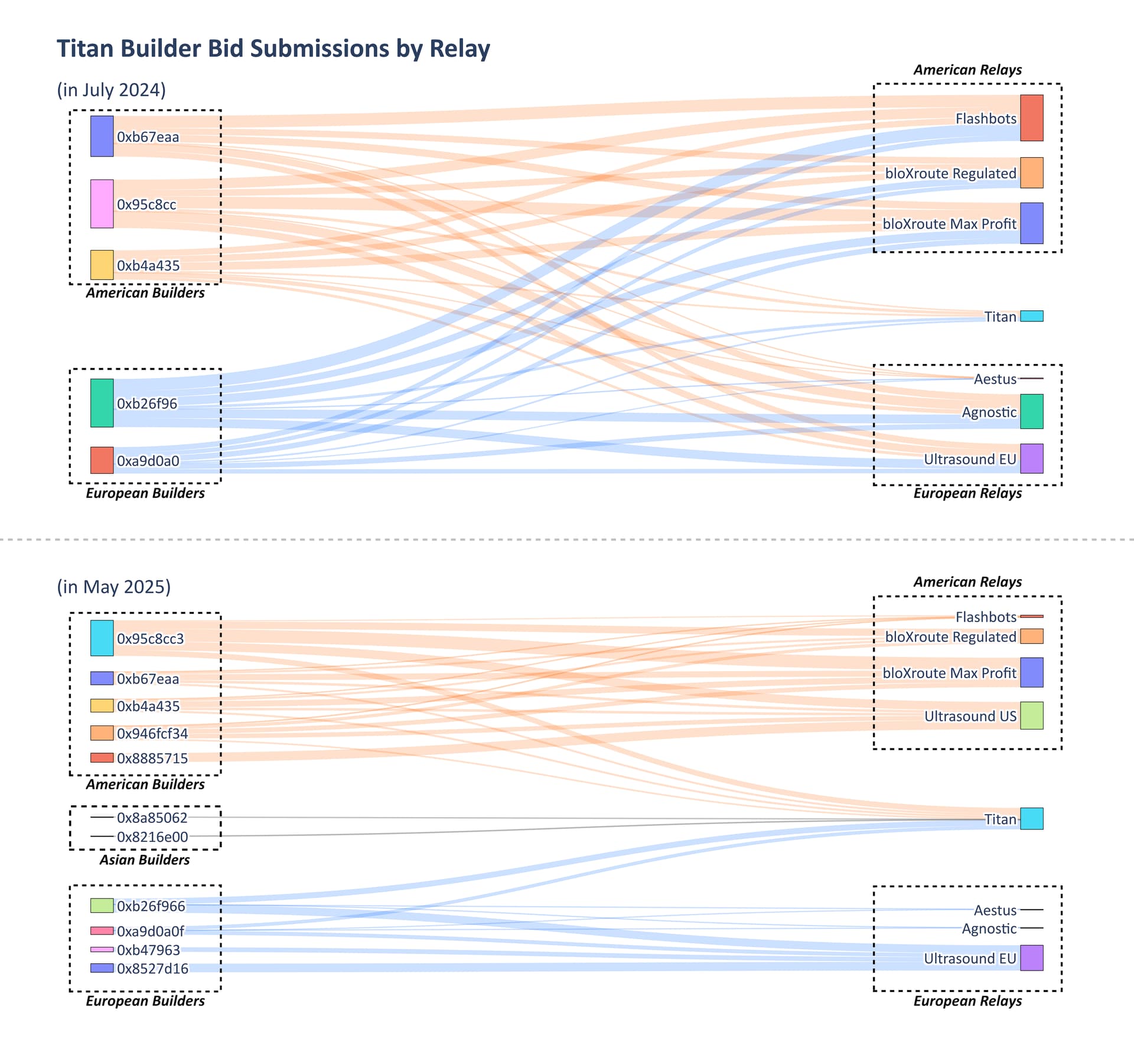 Figure 7: the evolution of bid submission strategies for Titan Builder. We see that in July 2024, Titan was submitting bids from all builders to all relays, independent of their respective geographies. However, by May 2025, Titan had shifted strategies and now only submits bids to relays geographically close to their builder instances.