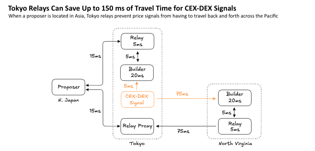 Figure 2: the path of information flow for a CEX-DEX signal originating in Tokyo when the block proposer is also located in Japan. Although a relay proxy minimizes the last leg of travel time between the proposer and a North American relay, the additional ~150 ms of latency from crossing the Pacific Ocean twice gives Asian relays a competitive advantage.