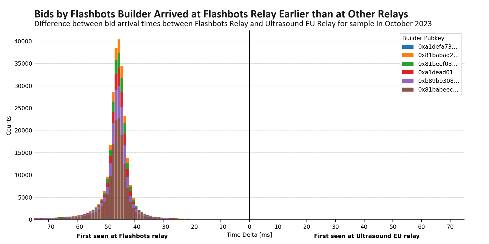 Figure 4: the difference in bid arrival times for matching transaction hashes submitted by the Flashbots Builder to Flashbots Relay and Ultrasound’s European relay in October 2023. We see that bids from the Flashbots Builder arrived significantly earlier to the Flashbots Relay during this period.