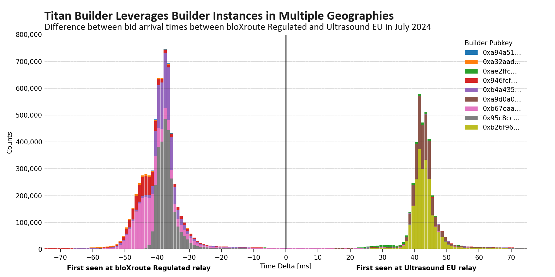 Running the same analysis on Titan Builder—this time with data from July 2024, we see in Figure 5 that the distribution for the 0xb26f builder instance matches our earlier intuition, with bids arriving earlier at the Ultrasound Relay’s European auction. However, in this case we also see a mirror of bids that arrive earlier at bloXroute’s relay in North Virginia. This demonstrates that Titan ran builder instances in different jurisdictions, allowing it to be more competitive in auctions across multiple geographies.
