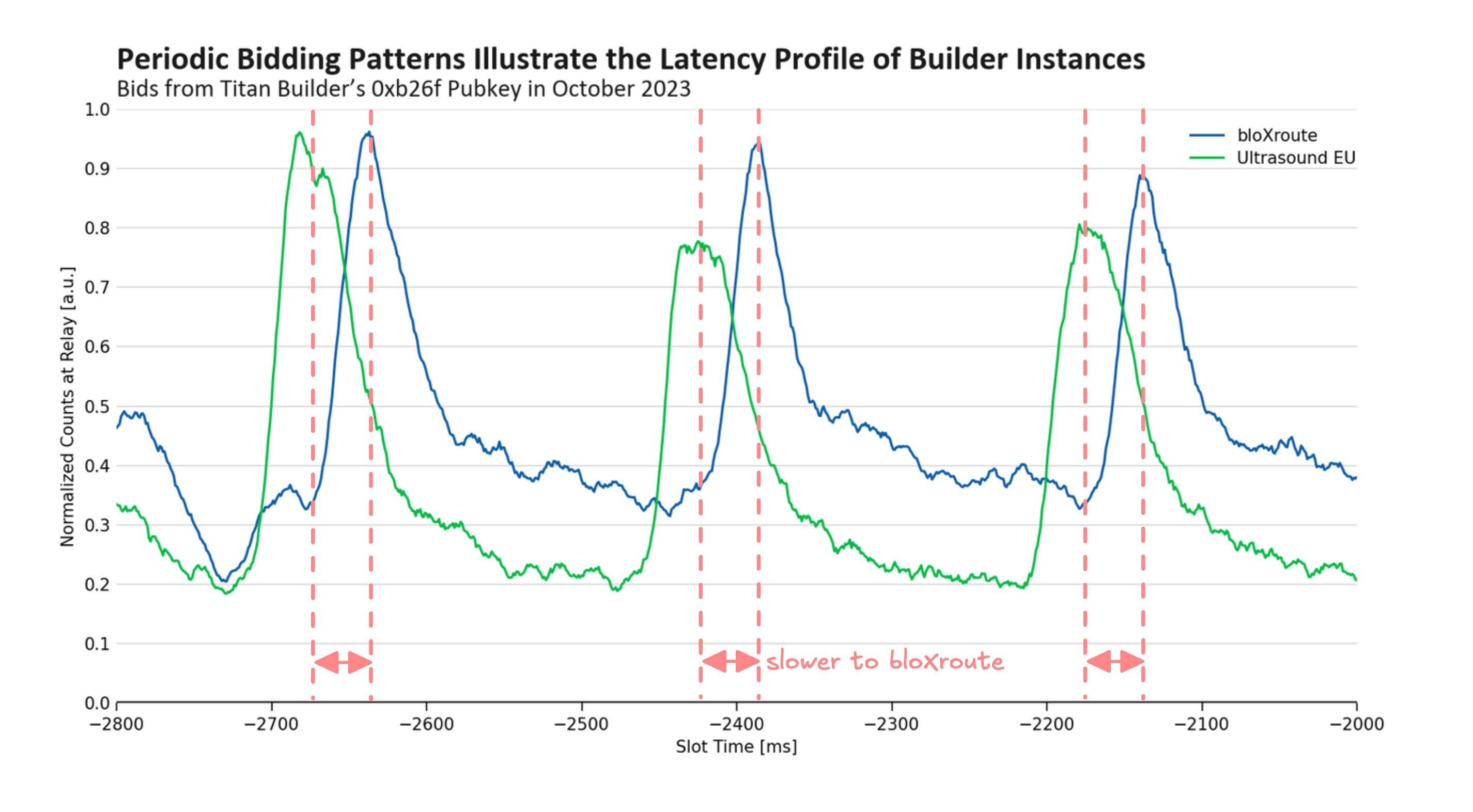 Figure 3: a cutout of bid arrival times for one of Titan’s builder instances in October 2023. During this period of time, the instance was bidding at fixed 250 ms intervals, allowing us to infer the difference in propagation time to geographically distant relays. We see that bids for the 0xb26f pubkey tended to arrive about 40 ms earlier at Ultrasound’s European relay relative to bloXroute’s relays in North Virginia.