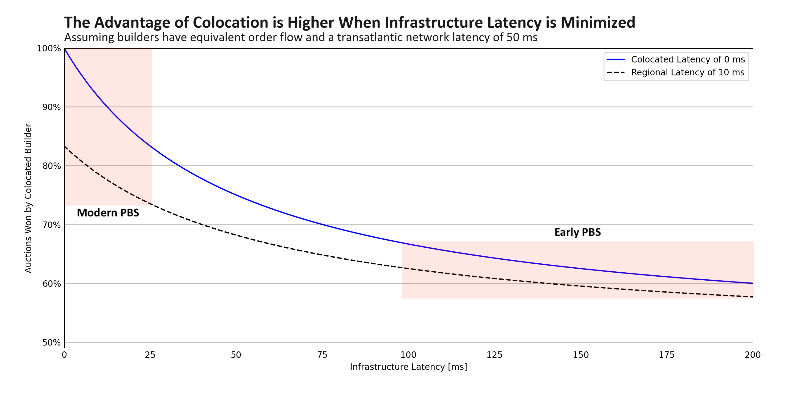 Table 2: example end-to-end latency for a regional v.s. a transatlantic block builder in the early days of PBS. Assuming that the builders have equivalent order flow, the regional builder should win approximately 58% of the auctions.