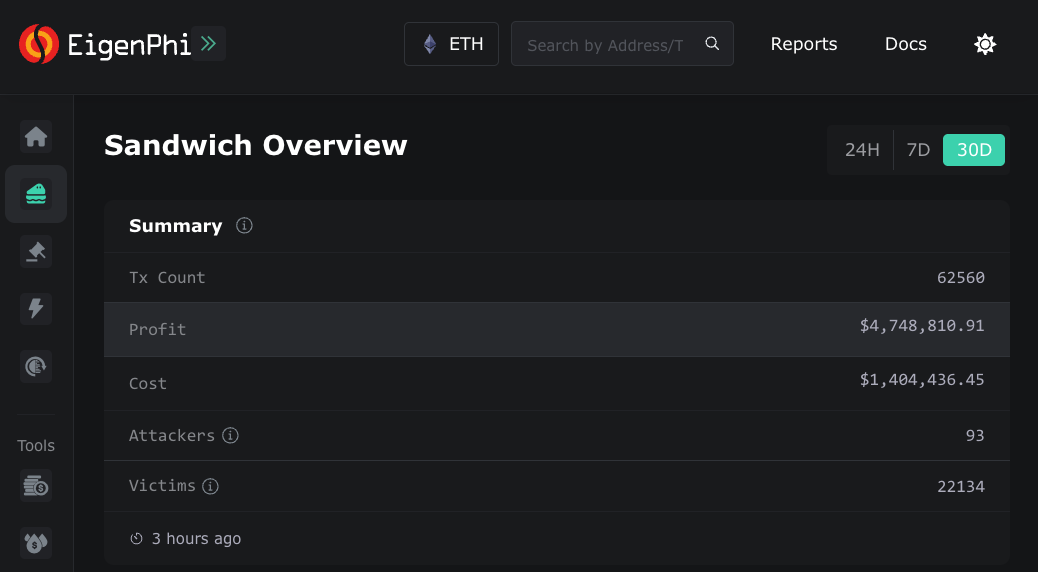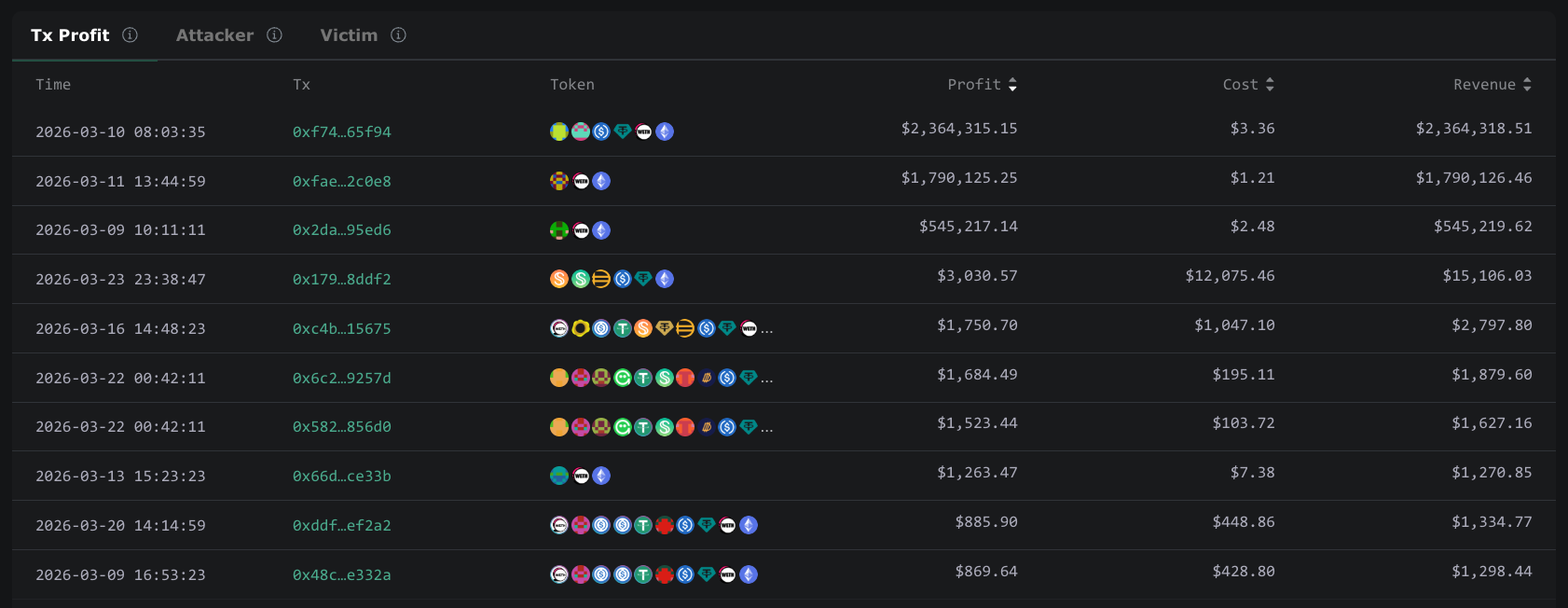 At the time of writing, 30-day profits for sandwich bots are listed at $4.749 million. The cost of these attacks—base fees burned by the protocol and tips captured by builders and proposers—is listed at $1.404 million. That should immediately feel wrong. Sandwiching is usually crowded and adversarial, if bots are keeping almost all of the upside, either market structure has changed dramatically or the accounting has gone wrong.