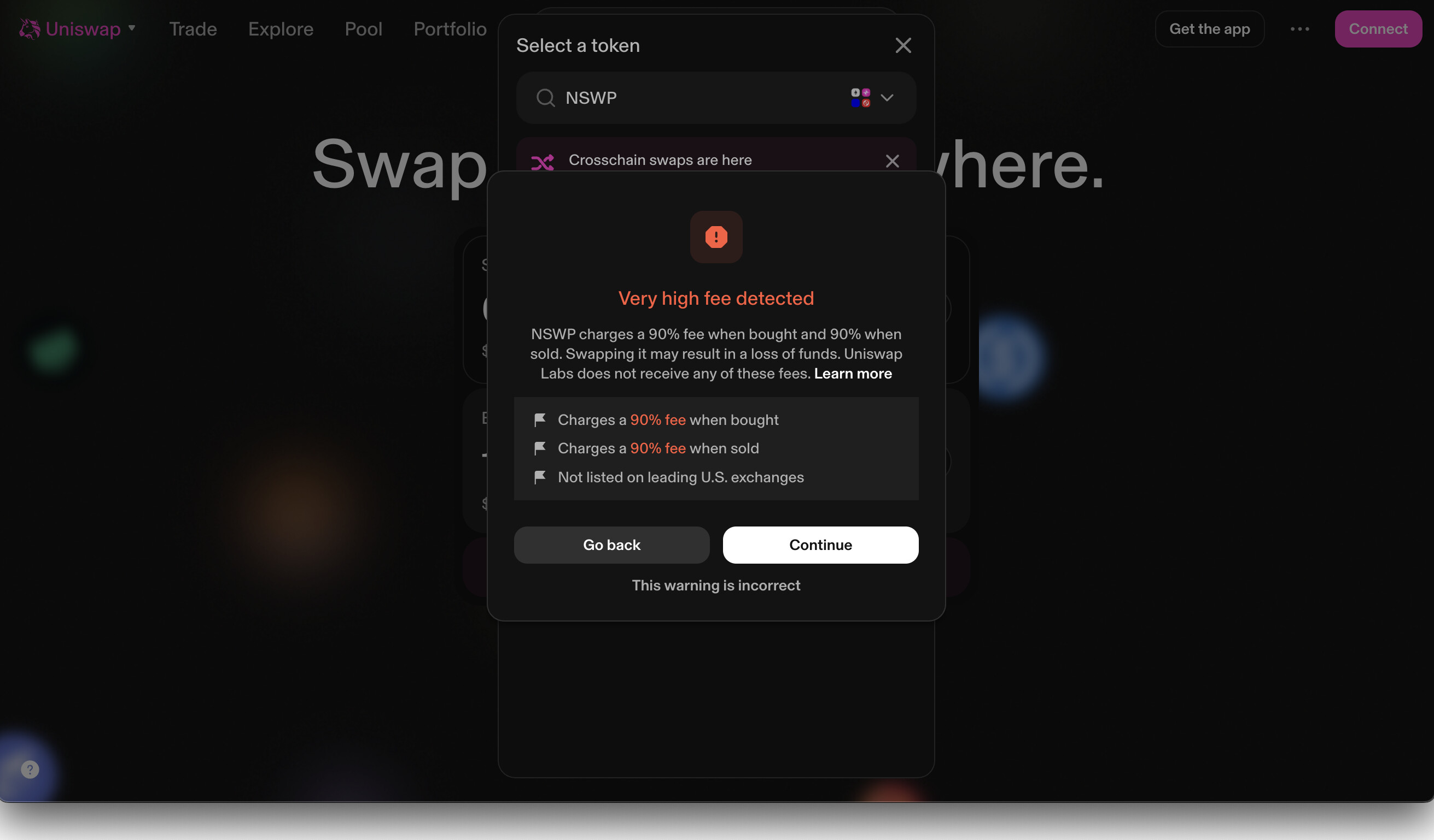 If you try to place a NSWP swap on Uniswap, it flags that the contract charges a 90% fee on all trades. If we inspect the logs for the transaction, we see that the actual swap was not actually 7,400 NSWP but in reality 740 NSWP —explaining how the profit got logged at nearly $1.8 million.